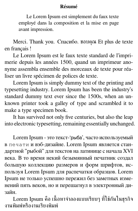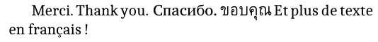 We’ve prepared a small example of a (primarily) French document which also contains some English, Russian and Thai text. We’ve decided to use the FreeSerif, FreeSans and FreeMono typefaces.