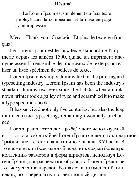 Certainly, the Latin and Cyrillic glyphs are all rendered in the output PDF, but note that some words are now hyphenated incorrectly: ‘unk-nown’ and ‘unchan-ged’—and стандартной isn’t hyphenated at all. Without the language-switching environments, the compiler thinks these text items are still in the French language and attempts to typeset them using French conventions. The compiler tries to apply French hyphenation rules which, naturally, produce incorrect results. This is why typography and typesetting is so much more than just font design and selection: they are very language- and culture-specific disciplines.
